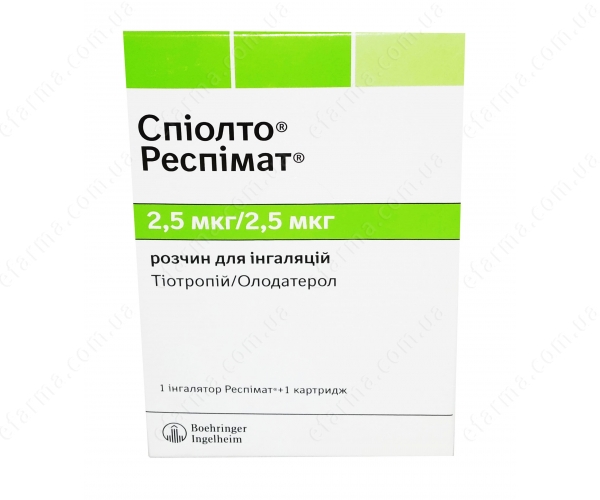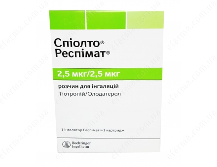 | Форма випуску: | розчин для інгаляцій 2,5 мкг/2,5 мкг в картриджах по 4 мл (60 інгаляцій) у комплекті з інгалятором Респимат 1 шт |